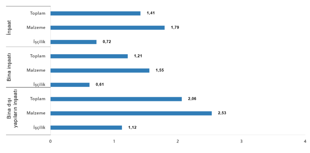 Bina dışı yapılar için inşaat maliyet endeksi, bir önceki aya göre %2,06 arttı, bir önceki yılın aynı ayına göre %23,51 arttı. Bir önceki aya göre malzeme endeksi %2,53 arttı, işçilik endeksi %1,12 arttı. Ayrıca bir önceki yılın aynı ayına göre malzeme endeksi %19,21 arttı, işçilik endeksi %33,32 arttı.