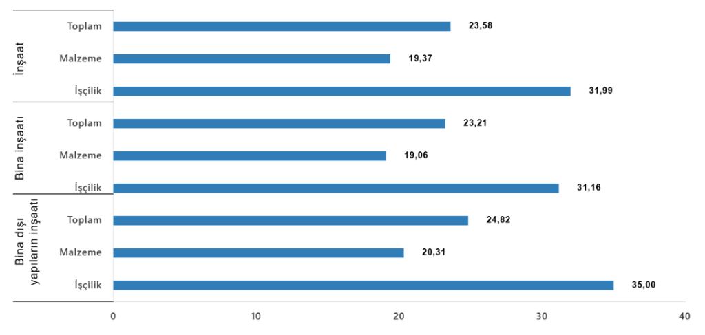 Bina inşaatı maliyet endeksi, bir önceki aya göre %0,97 arttı, bir önceki yılın aynı ayına göre %23,21 arttı. Bir önceki aya göre malzeme endeksi %1,76 arttı, işçilik endeksi %0,38 azaldı. Ayrıca bir önceki yılın aynı ayına göre malzeme endeksi %19,06 arttı, işçilik endeksi %31,16 arttı.