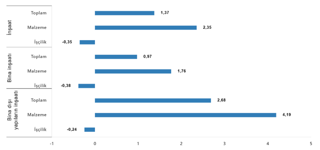Bina dışı yapılar için inşaat maliyet endeksi, bir önceki aya göre %2,68 arttı, bir önceki yılın aynı ayına göre %24,82 arttı. Bir önceki aya göre malzeme endeksi %4,19 arttı, işçilik endeksi %0,24 azaldı. Ayrıca bir önceki yılın aynı ayına göre malzeme endeksi %20,31 arttı, işçilik endeksi %35,00 arttı.