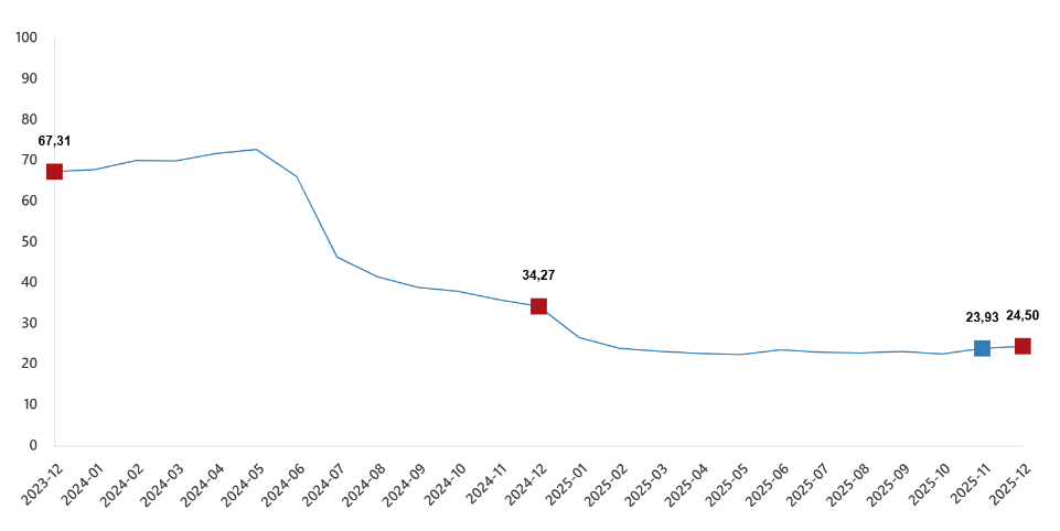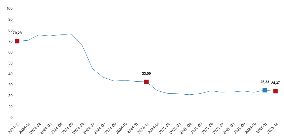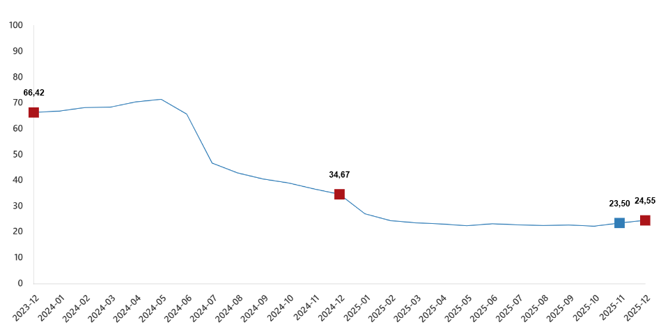 İnşaat maliyet endeksi yıllık değişim oranları(%), Aralık 2025