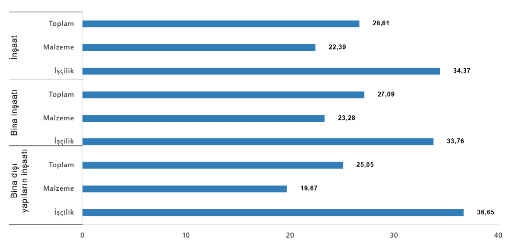 Bina inşaatı maliyet endeksi, bir önceki aya göre %9,39 arttı, bir önceki yılın aynı ayına göre %27,09 arttı. Bir önceki aya göre malzeme endeksi %1,91 arttı, işçilik endeksi %24,14 arttı. Ayrıca bir önceki yılın aynı ayına göre malzeme endeksi %23,28 arttı, işçilik endeksi %33,76 arttı.