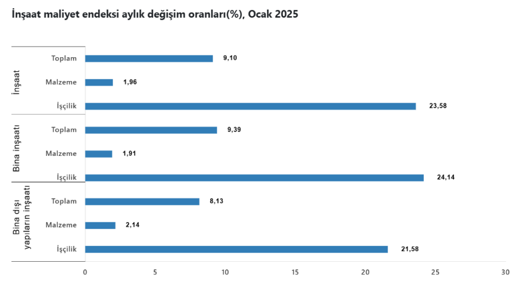 İnşaat maliyet endeksi, 2025 yılı Ocak ayında bir önceki aya göre %9,10 arttı, bir önceki yılın aynı ayına göre %26,61 arttı. Bir önceki aya göre malzeme endeksi %1,96 arttı, işçilik endeksi %23,58 arttı. Ayrıca bir önceki yılın aynı ayına göre malzeme endeksi %22,39 arttı, işçilik endeksi %34,37 arttı.