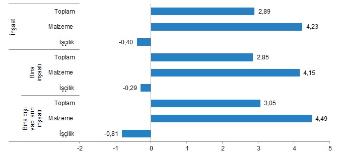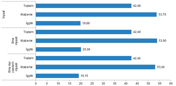 Bina inşaatı maliyet endeksi, bir önceki aya göre %2.85, bir önceki yılın aynı ayına göre %42.49 arttı. Bir önceki aya göre malzeme endeksi %4.15 arttı; işçilik endeksi %0.29 azaldı. Ayrıca bir önceki yılın aynı ayına göre malzeme endeksi %53.90, işçilik endeksi %20.08 arttı.