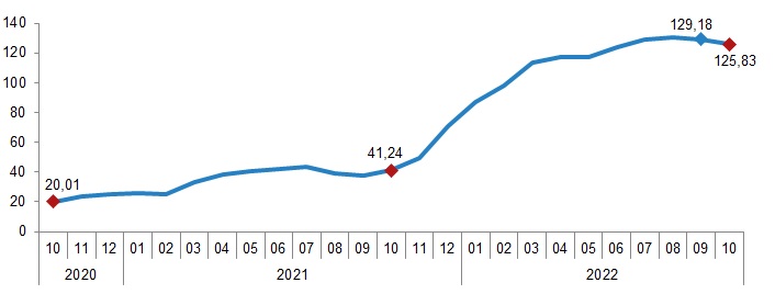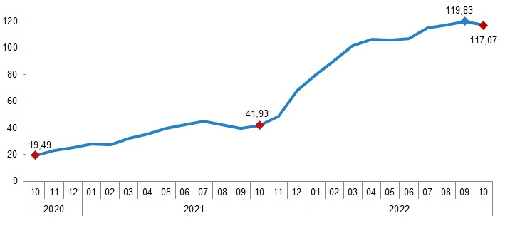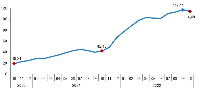 İnşaat maliyet endeksi, 2022 yılı Ekim ayında bir önceki aya göre %3,44, bir önceki yılın aynı ayına göre %117,07 arttı. Bir önceki aya göre malzeme endeksi %3,88, işçilik endeksi %1,94 arttı. Ayrıca bir önceki yılın aynı ayına göre malzeme endeksi %128,41, işçilik endeksi %85,65 arttı.