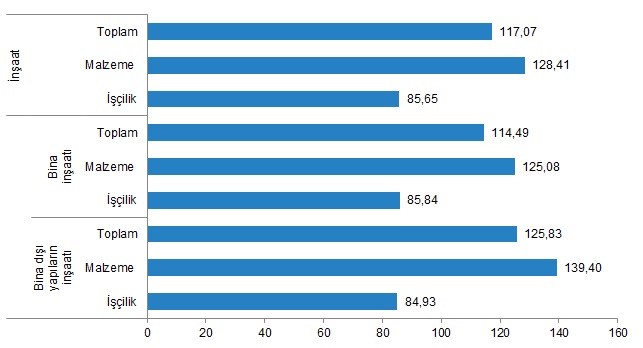 Bina inşaatı maliyet endeksi, bir önceki aya göre %3,11, bir önceki yılın aynı ayına göre %114,49 arttı. Bir önceki aya göre malzeme endeksi %3,49, işçilik endeksi %1,91 arttı. Ayrıca bir önceki yılın aynı ayına göre malzeme endeksi %125,08, işçilik endeksi %85,84 arttı.