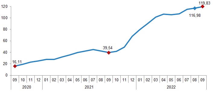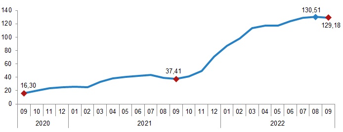 İnşaat maliyet endeksi, 2022 yılı Eylül ayında bir önceki aya göre %1,57, bir önceki yılın aynı ayına göre %119,83 arttı. Bir önceki aya göre malzeme endeksi %2,07 arttı, işçilik endeksi %0,07 azaldı. Ayrıca bir önceki yılın aynı ayına göre malzeme endeksi %133,40, işçilik endeksi %84,04 arttı.