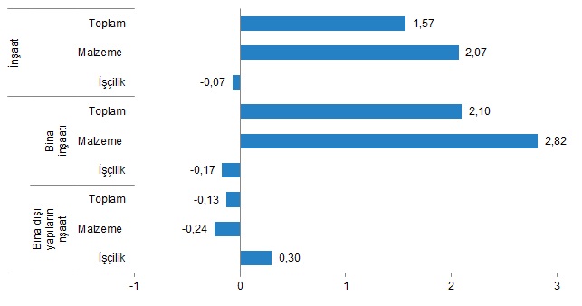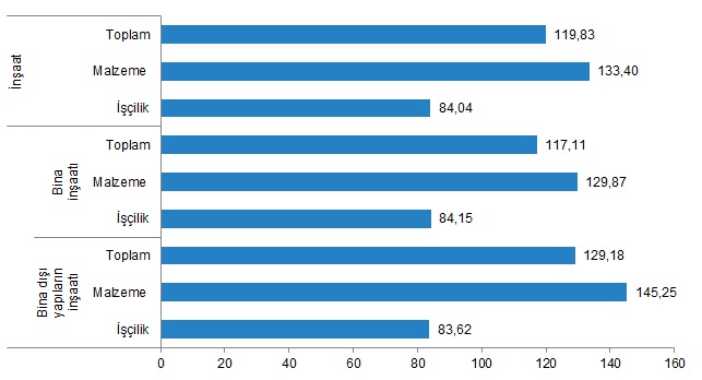 Bina inşaatı maliyet endeksi, bir önceki aya göre %2,10, bir önceki yılın aynı ayına göre %117,11 arttı. Bir önceki aya göre malzeme endeksi %2,82 arttı, işçilik endeksi %0,17 azaldı. Ayrıca bir önceki yılın aynı ayına göre malzeme endeksi %129,87, işçilik endeksi %84,15 arttı.