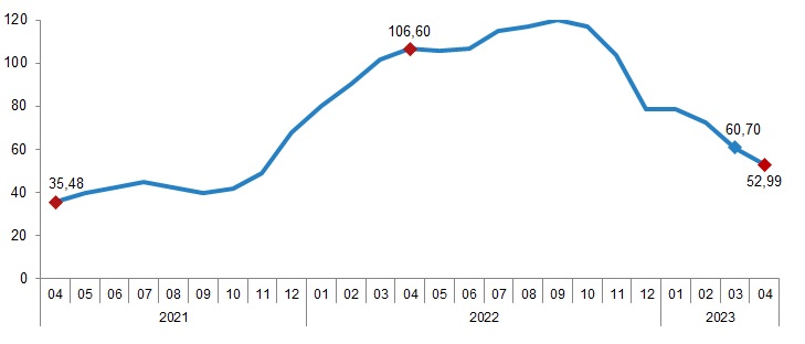 İnşaat maliyet endeksi, 2023 yılı Nisan ayında bir önceki aya göre %1,03, bir önceki yılın aynı ayına göre %52,99 arttı. Bir önceki aya göre malzeme endeksi %1,37, işçilik endeksi %0,18 arttı. Ayrıca bir önceki yılın aynı ayına göre malzeme endeksi %39,80, işçilik endeksi %102,72 arttı.