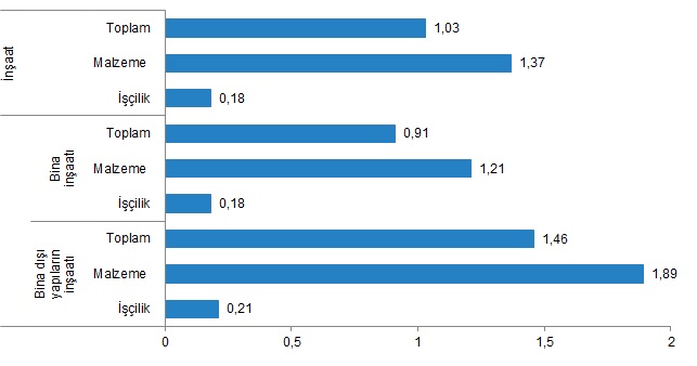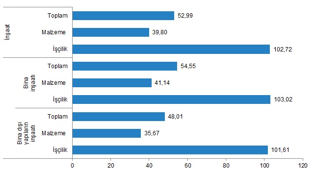 Bina inşaatı maliyet endeksi, bir önceki aya göre %0,91, bir önceki yılın aynı ayına göre %54,55 arttı. Bir önceki aya göre malzeme endeksi %1,21, işçilik endeksi %0,18 arttı. Ayrıca bir önceki yılın aynı ayına göre malzeme endeksi %41,14, işçilik endeksi %103,02 arttı.