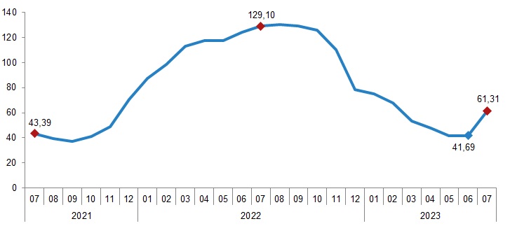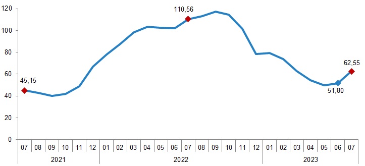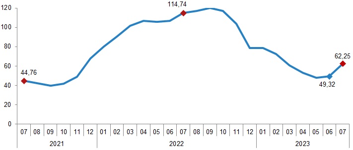 İnşaat maliyet endeksi, 2023 yılı Temmuz ayında bir önceki aya göre %15,67, bir önceki yılın aynı ayına göre %62,25 arttı. Bir önceki aya göre malzeme endeksi %9,76, işçilik endeksi %31,66 arttı. Ayrıca bir önceki yılın aynı ayına göre malzeme endeksi %47,01, işçilik endeksi %111,68 arttı.