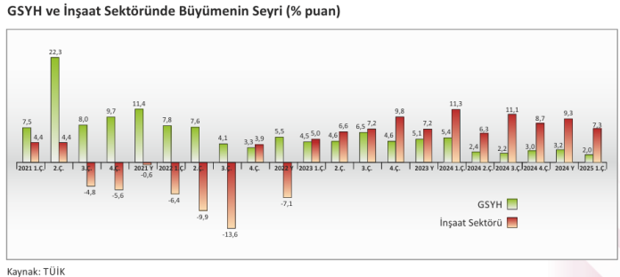 Bu koşullar altında 2025 yılı ilk çeyreğini tamamlayan inşaat sektörü, %7,3 ile genel ekonominin üzerinde bir büyüme kaydetmiştir. Böylece sektör, ivme kaybetmesine rağmen deprem bölgesinin yeniden imarı ve büyükşehirlerde devam eden kentsel dönüşüm çalışmalarının da etkisiyle üst üste 10 çeyrek kesintisiz büyümeye devam etmiştir.
