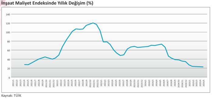 TÜİK tarafından açıklanan İnşaat Maliyet Endeksi verilerine göre malzeme ve işçilik maliyetlerindeki artış yavaşlamaya devam etmiştir. Endeks, Mayıs ayında aylık bazda %0,88, yıllık bazda ise %22,40 oranında artmıştır. Böylece Kasım 2020’den bu yana en düşük yıllık artış görülmüştür. İnşaat Maliyet Endeksi kapsamındaki malzeme endeksi Mayıs’ta aylık bazda %1,09 ve yıllık bazda %17,81 artarken; işçilik endeksi aylık bazda %0,52, yıllık bazda ise %31,9 yükselmiştir.