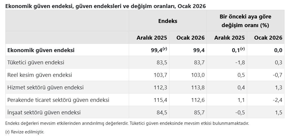 Ekonomik güven endeksi Ocak ayında aynı düzeyde kalarak 99,4 değerini aldı.