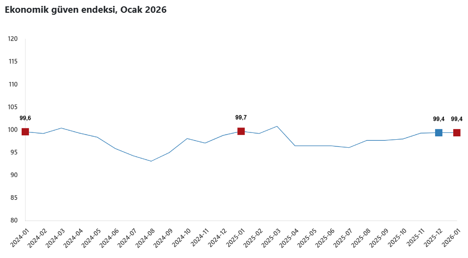Ekonomik güven endeksi Ocak ayında aynı düzeyde kalarak 99,4 değerini aldı.
