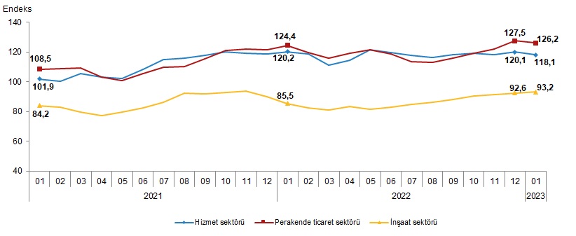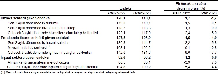 Mevsim etkilerinden arındırılmış güven endeksi 2023 Ocak ayında bir önceki aya göre; hizmet sektöründe %1,7 ve perakende ticaret sektöründe %1,0 azalırken, inşaat sektöründe %0,6 arttı.