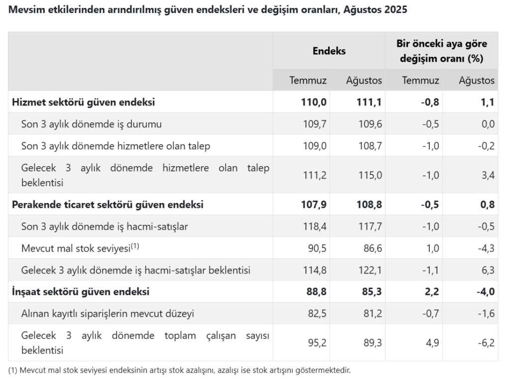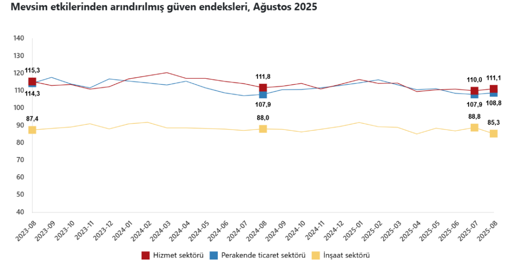Türkiye İstatistik Kurumu (TÜİK) Ağustos 2025 itibarıyla Hizmet, Perakende Ticaret ve İnşaat Güven Endekslerini açıkladı. Buna göre Güven endeksi; hizmet sektöründe %1,1 arttı, perakende ticaret sektöründe %0,8 arttı, inşaat sektöründe %4,0 azaldı.
