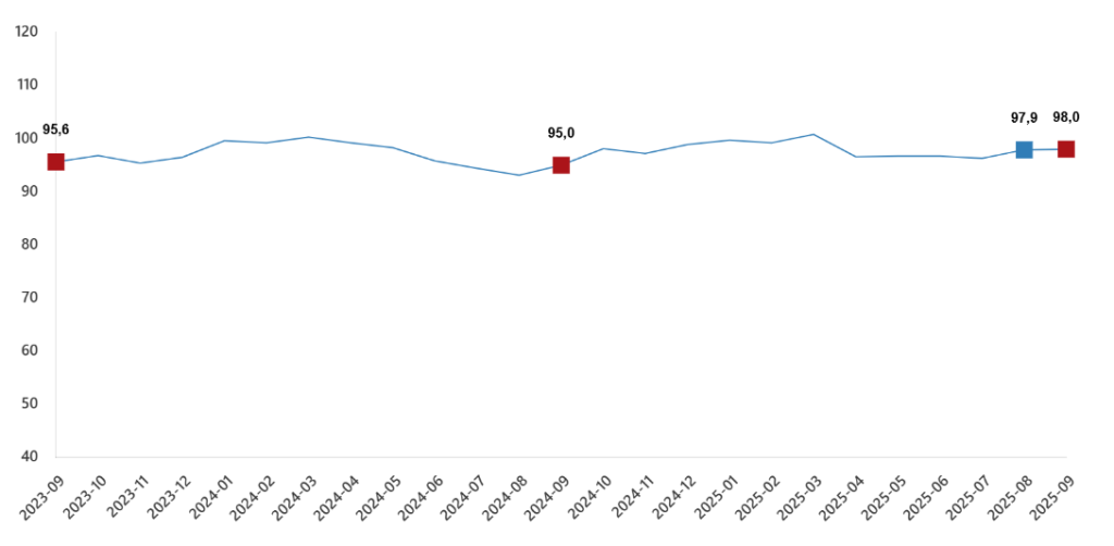 Ekonomik güven endeksi Ağustos ayında 97,9 iken, Eylül ayında %0,1 oranında artarak 98,0 değerini aldı.