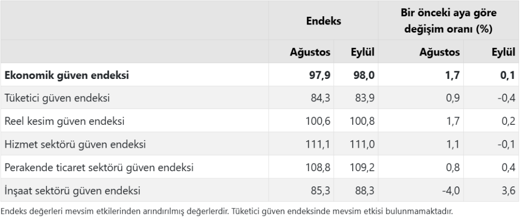 Bir önceki aya göre Eylül ayında tüketici güven endeksi %0,4 oranında azalarak 83,9 değerini, reel kesim (imalat sanayi) güven endeksi %0,2 oranında artarak 100,8 değerini, hizmet sektörü güven endeksi %0,1 oranında azalarak 111,0 değerini, perakende ticaret sektörü güven endeksi %0,4 oranında artarak 109,2 değerini, inşaat sektörü güven endeksi %3,6 oranında artarak 88,3 değerini aldı.