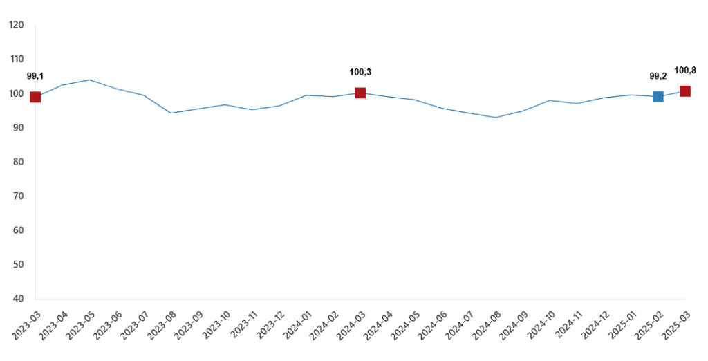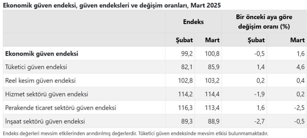 Ekonomik güven endeksi Şubat ayında 99,2 iken, Mart ayında %1,6 oranında artarak 100,8 değerini aldı.