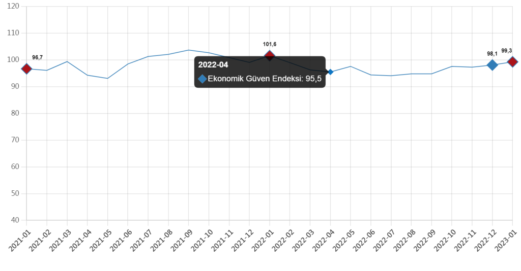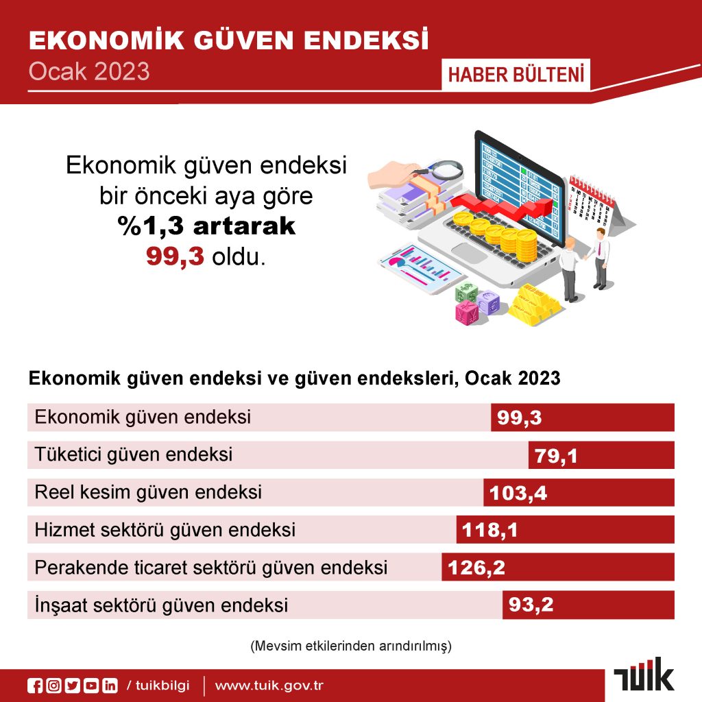 Türkiye İstatistik Kurumu (TÜİK) tarafından açıklanan Ocak 2023 Ekonomik Güven Endeksi verilerine göre, aralık ayında 98.1 olan endeks puanı, 2023 yılının ilk ayında yüzde 1.3 oranında artarak 99.3 oldu.