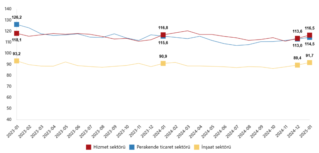 Mevsim etkilerinden arındırılmış güven endeksi Ocak ayında bir önceki aya göre; hizmet sektöründe %2,5 oranında artarak 116,5 değerini, perakende ticaret sektöründe %1,4 oranında artarak 114,5 değerini ve inşaat sektöründe %2,6 oranında artarak 91,7 değerini aldı.