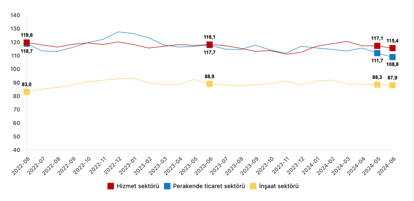 Mevsim etkilerinden arındırılmış güven endeksi Haziran ayında bir önceki aya göre; hizmet sektöründe %1,5 oranında azalarak 115,4 değerini, perakende ticaret sektöründe %2,6 oranında azalarak 108,8 değerini ve inşaat sektöründe %0,5 oranında azalarak 87,9 değerini aldı.