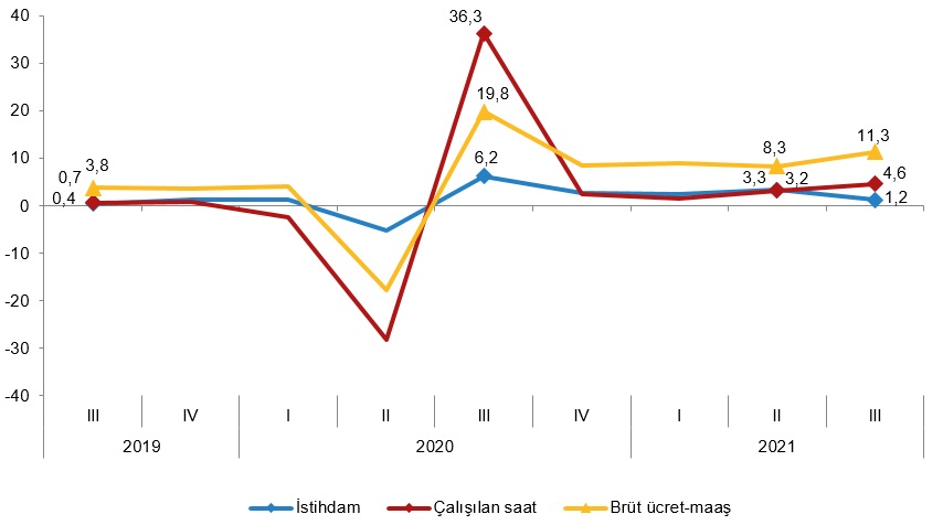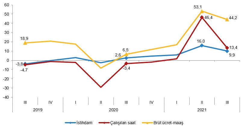 Sanayi, inşaat ve ticaret-hizmet sektörleri toplamında brüt ücret-maaş endeksi, 2021 yılı lll. çeyreğinde bir önceki yılın aynı çeyreğine göre %44,2 arttı. Alt sektörler incelendiğinde, endeks; sanayi sektöründe %42,3, inşaat sektöründe %40,9 ve ticaret-hizmet sektörlerinde %45,9 arttı.