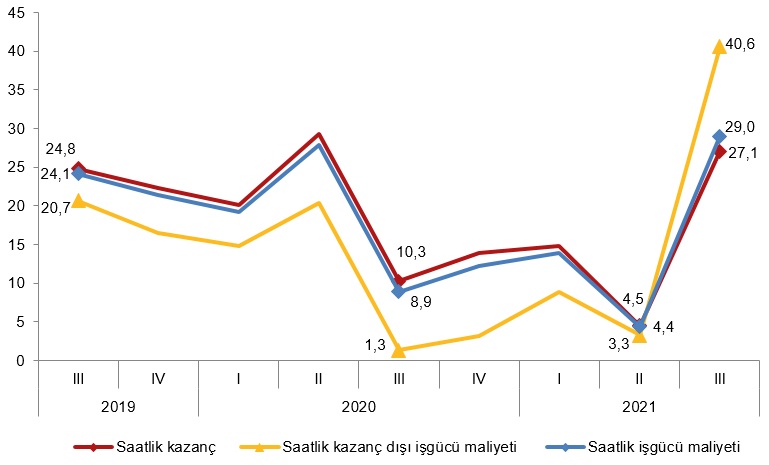Sanayi, inşaat ve ticaret-hizmet sektörleri toplamında saatlik kazanç dışı işgücü maliyeti endeksi, 2021 yılı lll. çeyreğinde bir önceki yılın aynı çeyreğine göre %40,6 arttı. Alt sektörler incelendiğinde, endeks; sanayi sektöründe %46,2, inşaat sektöründe %29,5, ticaret-hizmet sektörlerinde %38,7 arttı.