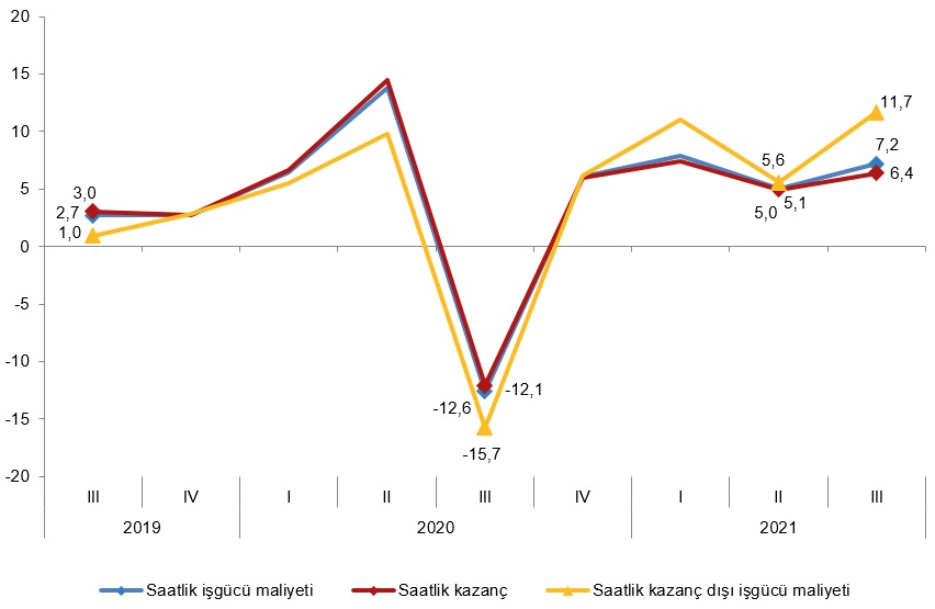 Sanayi, inşaat ve ticaret-hizmet sektörleri toplamında saatlik işgücü maliyeti endeksi, 2021 yılı lll. çeyreğinde bir önceki çeyreğe göre %7,2 arttı. Alt sektörler incelendiğinde, endeks; sanayi sektöründe %7,8, inşaat sektöründe %3,4 ve ticaret-hizmet sektörlerinde %7,5 arttı.