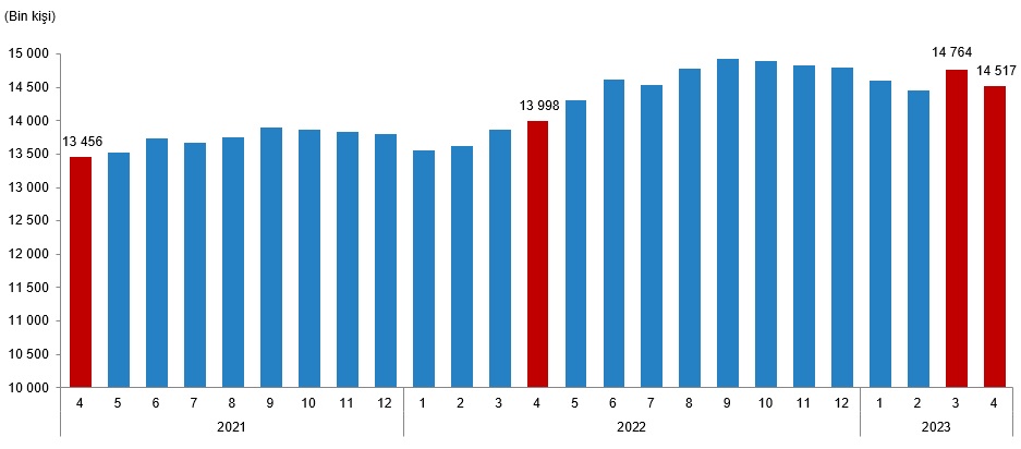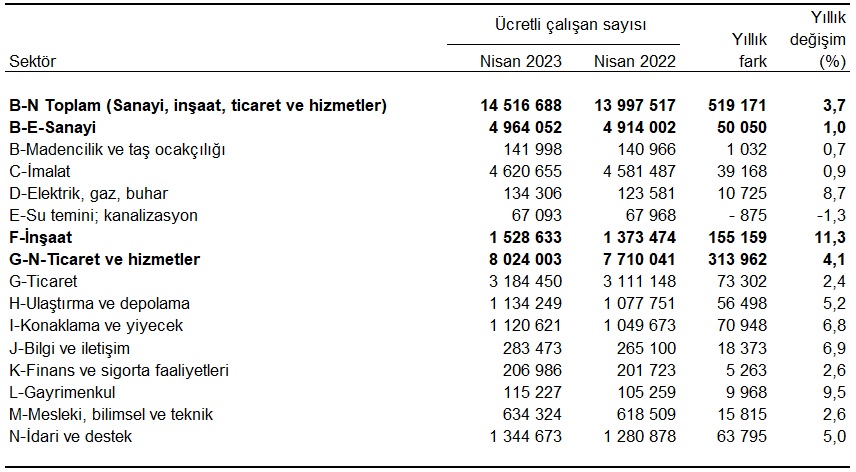 Sanayi, inşaat ve ticaret-hizmet sektörleri toplamında ücretli çalışan sayısı 2023 Nisan ayında bir önceki yılın aynı ayına göre %3,7 arttı. Ücretli çalışan sayısı bir önceki yılın aynı ayında 13 milyon 997 bin 517 kişi iken, 2023 yılı Nisan ayında 14 milyon 516 bin 688 kişi oldu.
