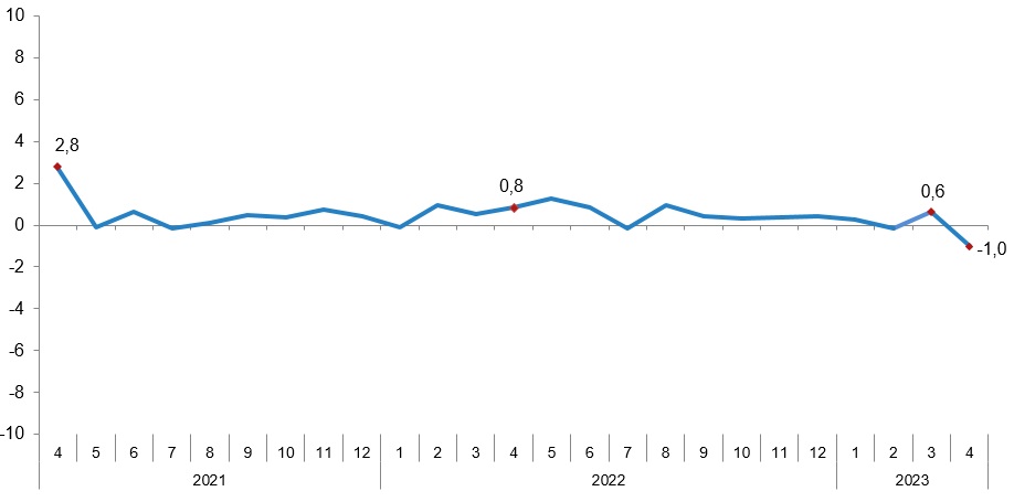 Sanayi, inşaat ve ticaret-hizmet sektörleri toplamında ücretli çalışan sayısı 2023 Nisan ayında bir önceki aya göre %1,0 azaldı.