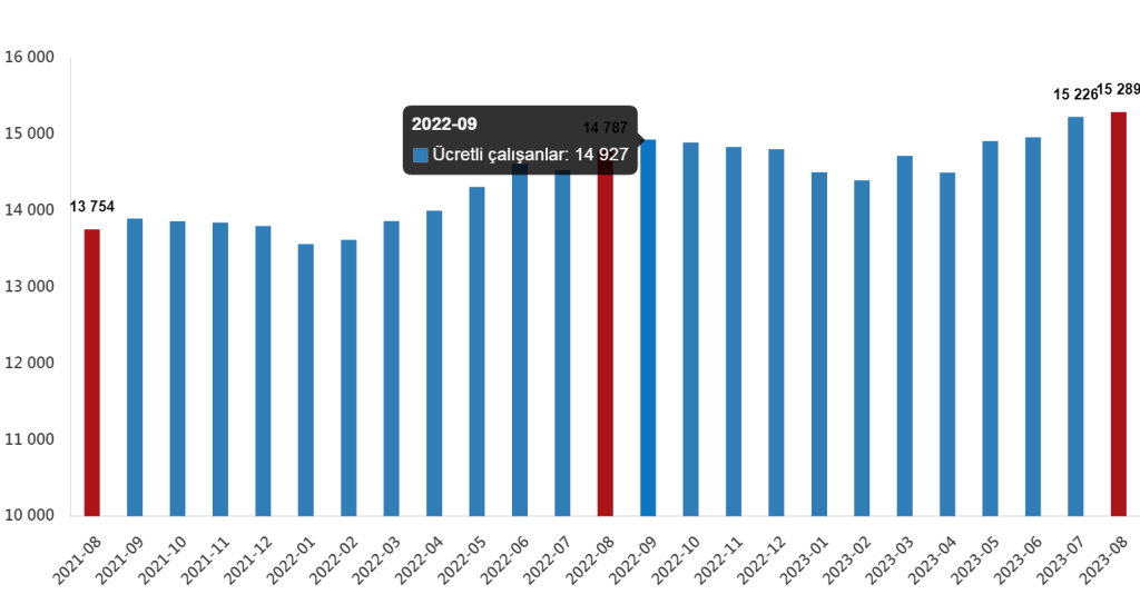 Sanayi, inşaat ve ticaret-hizmet sektörleri toplamında ücretli çalışan sayısı 2023 Ağustos ayında bir önceki yılın aynı ayına göre %3,4 arttı. Ücretli çalışan sayısı bir önceki yılın aynı ayında 14 milyon 786 bin 761 kişi iken, 2023 yılı Ağustos ayında 15 milyon 289 bin 258 kişi oldu.