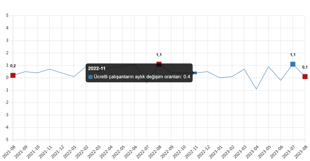Ücretli çalışanların alt detaylarına bakıldığında; 2023 Ağustos ayında ücretli çalışanlar aylık olarak sanayi sektöründe %0,3 azaldı, inşaat sektöründe %0,3 arttı ve ticaret-hizmet sektöründe %0,2 arttı.