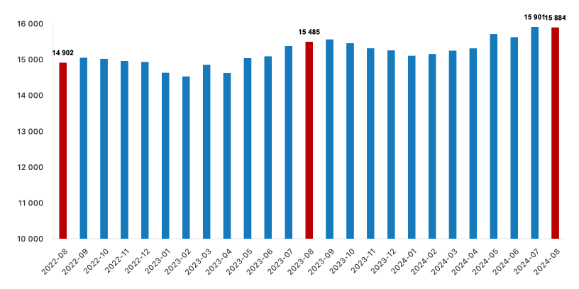 Sanayi, inşaat ve ticaret-hizmet sektörleri toplamında ücretli çalışan sayısı 2024 Ağustos ayında bir önceki yılın aynı ayına göre %2,6 arttı. Ücretli çalışan sayısı bir önceki yılın aynı ayında 15 milyon 484 bin 782 kişi iken, 2024 yılı Ağustos ayında 15 milyon 883 bin 831 kişi oldu.