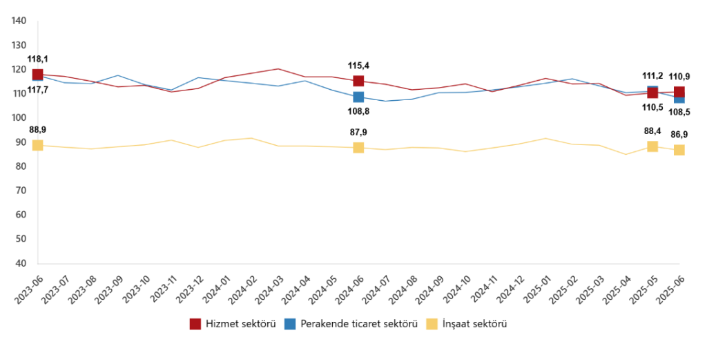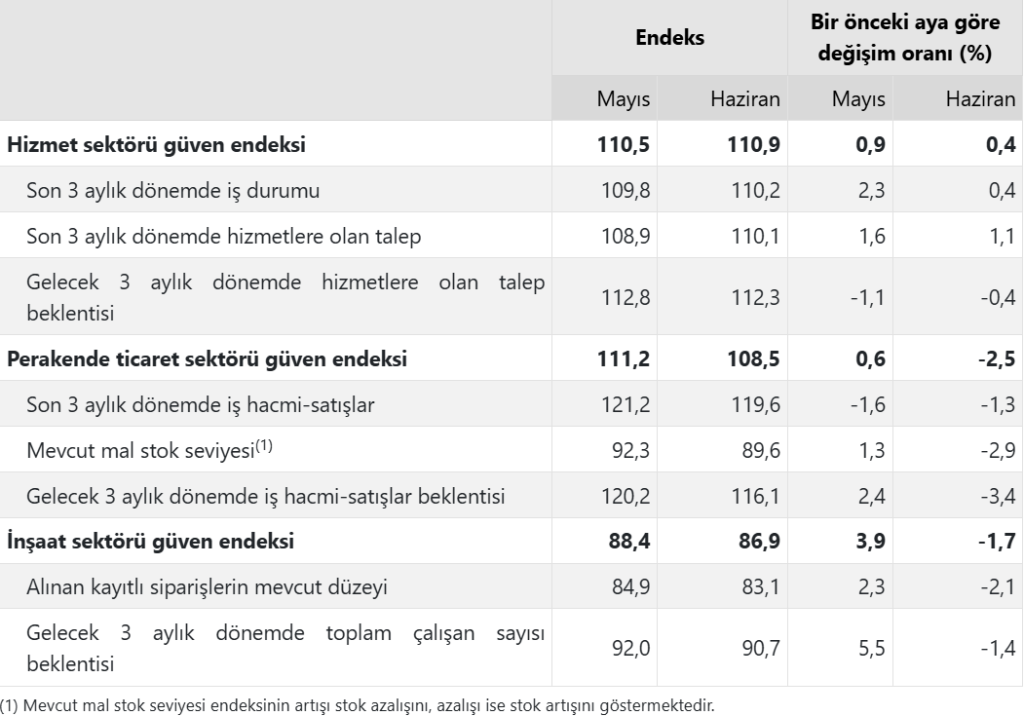 Mevsim etkilerinden arındırılmış güven endeksi Haziran ayında bir önceki aya göre; hizmet sektöründe %0,4 oranında artarak 110,9 değerini, perakende ticaret sektöründe %2,5 oranında azalarak 108,5 değerini ve inşaat sektöründe %1,7 oranında azalarak 86,9 değerini aldı.