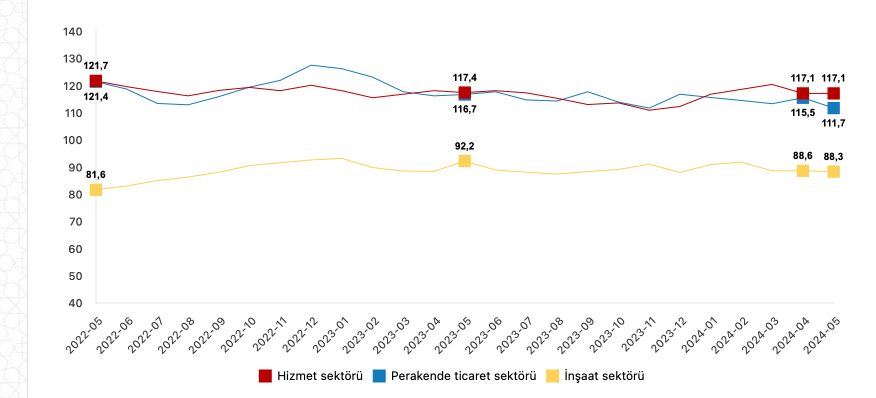 Mevsim etkilerinden arındırılmış güven endeksi Mayıs ayında bir önceki aya göre; hizmet sektöründe aynı düzeyde kalarak 117,1 değerini, perakende ticaret sektöründe %3,3 oranında azalarak 111,7 değerini ve inşaat sektöründe %0,3 oranında azalarak 88,3 değerini aldı.