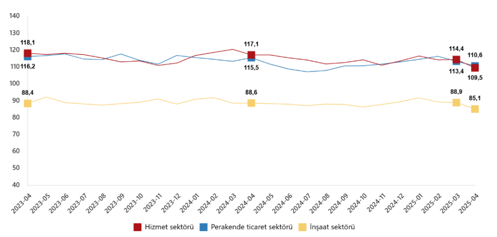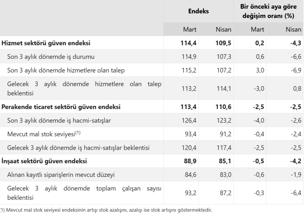 Mevsim etkilerinden arındırılmış güven endeksi Nisan ayında bir önceki aya göre; hizmet sektöründe %4,3 oranında azalarak 109,5 değerini, perakende ticaret sektöründe %2,5 oranında azalarak 110,6 değerini ve inşaat sektöründe %4,2 oranında azalarak 85,1 değerini aldı.