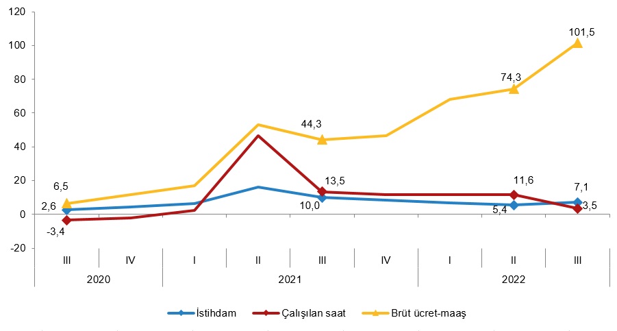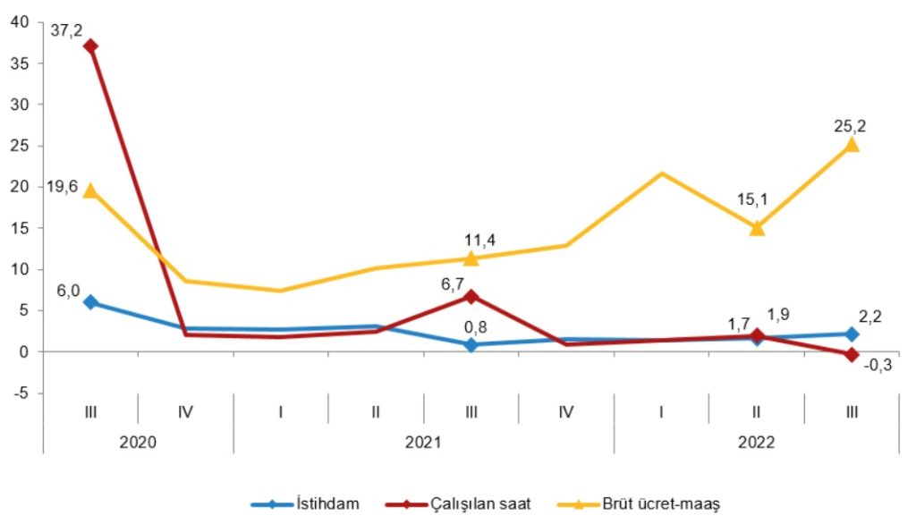 Sanayi, inşaat ve ticaret-hizmet sektörleri toplamında brüt ücret-maaş endeksi, 2022 yılı llI. çeyreğinde bir önceki çeyreğe göre %25,2 arttı. Alt sektörler incelendiğinde, endeks; sanayi sektöründe %23,1, inşaat sektöründe %26,5 ve ticaret-hizmet sektörlerinde %26,5 arttı.