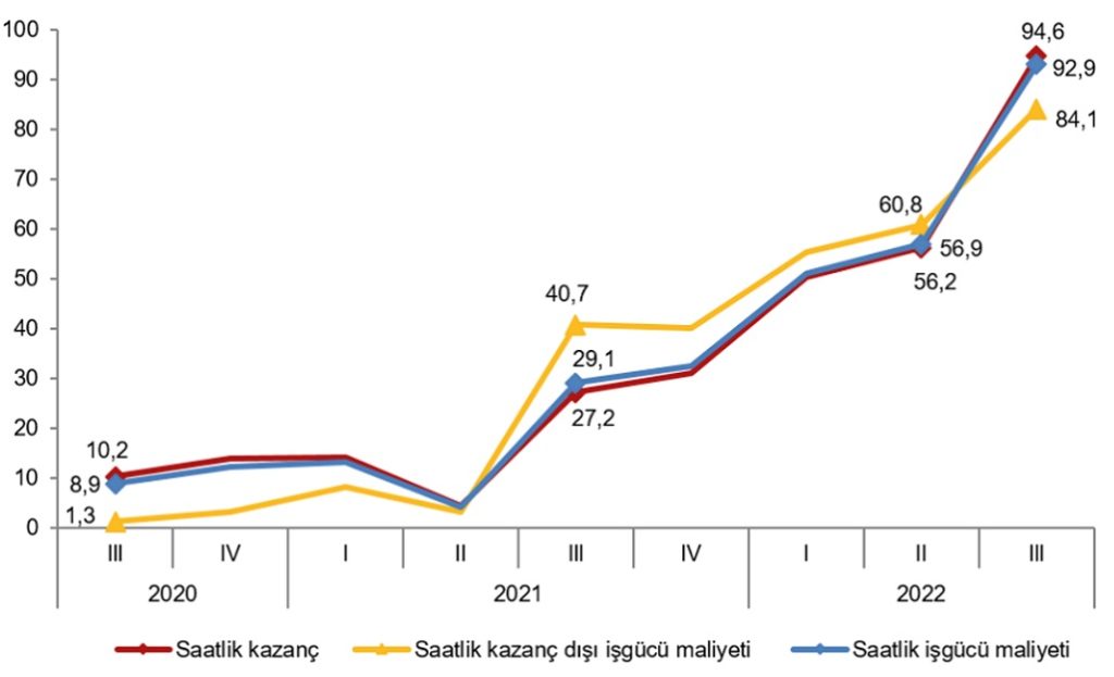 Sanayi, inşaat ve ticaret-hizmet sektörleri toplamında saatlik işgücü maliyeti endeksi, 2022 yılı llI. çeyreğinde bir önceki yılın aynı çeyreğine göre %92,9 arttı. Alt sektörler incelendiğinde, endeks; sanayi sektöründe %90,5, inşaat sektöründe %94,5 ve ticaret-hizmet sektörlerinde %93,8 arttı.