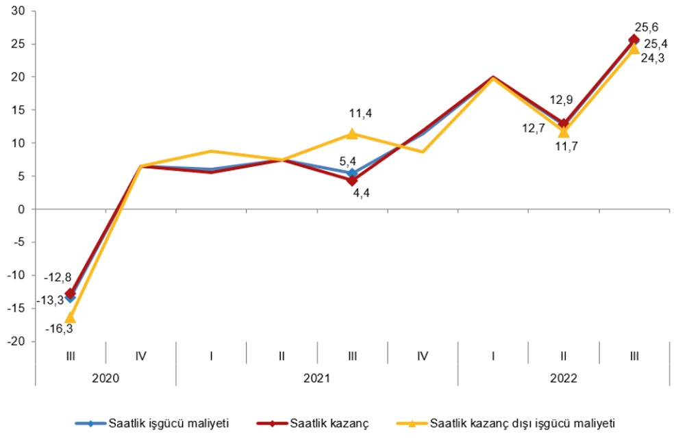Sanayi, inşaat ve ticaret-hizmet sektörleri toplamında saatlik kazanç dışı işgücü maliyeti endeksi, 2022 yılı llI. çeyreğinde bir önceki çeyreğe göre %24,3 arttı. Alt sektörler incelendiğinde, endeks; sanayi sektöründe %23,1, inşaat sektöründe %21,8 ve ticaret-hizmet sektörlerinde %25,6 arttı.