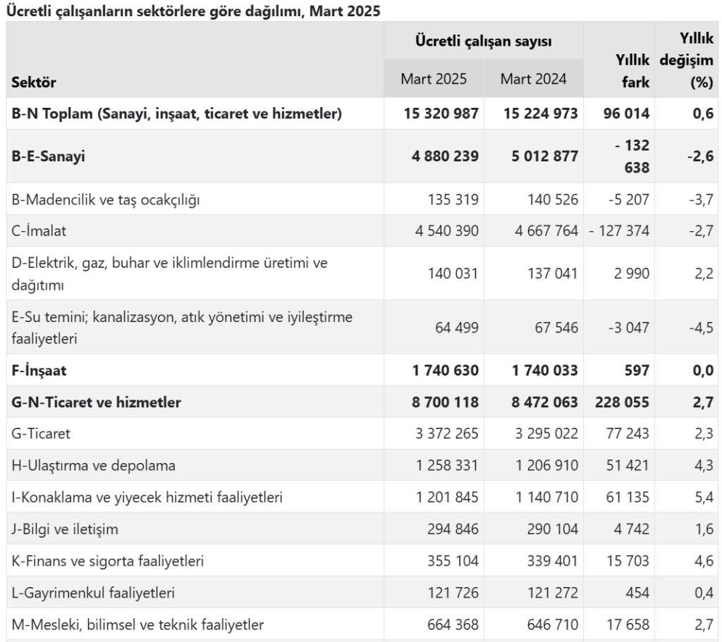 Ücretli çalışanların alt detaylarına bakıldığında; 2025 Mart ayında ücretli çalışan sayısı yıllık olarak sanayi sektöründe %2,6 azaldı, inşaat sektöründe aynı kaldı ve ticaret-hizmet sektöründe %2,7 arttı.