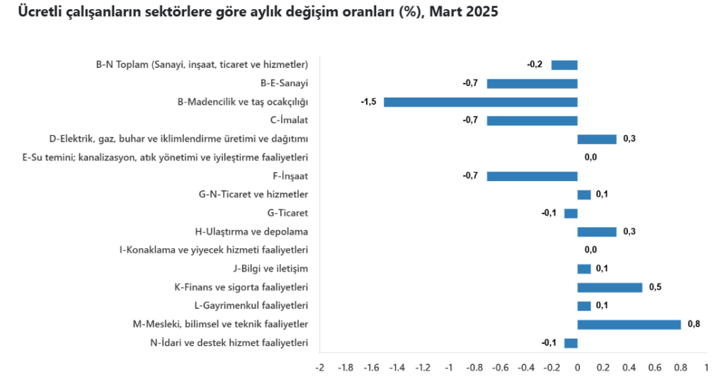 Ücretli çalışanların alt detaylarına bakıldığında; 2025 Mart ayında ücretli çalışanlar aylık olarak sanayi sektöründe %0,7 azaldı, inşaat sektöründe %0,7 azaldı ve ticaret-hizmet sektöründe %0,1 arttı.