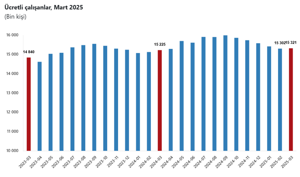Sanayi, inşaat ve ticaret-hizmet sektörleri toplamında ücretli çalışan sayısı 2025 Mart ayında bir önceki yılın aynı ayına göre %0,6 arttı. Ücretli çalışan sayısı bir önceki yılın aynı ayında 15 milyon 224 bin 973 kişi iken, 2025 yılı Mart ayında 15 milyon 320 bin 987 kişi oldu.