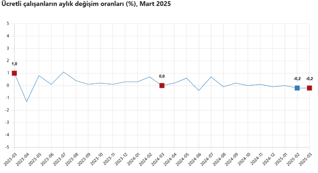 Ücretli çalışanların alt detaylarına bakıldığında; 2025 Mart ayında ücretli çalışanlar aylık olarak sanayi sektöründe %0,7 azaldı, inşaat sektöründe %0,7 azaldı ve ticaret-hizmet sektöründe %0,1 arttı.