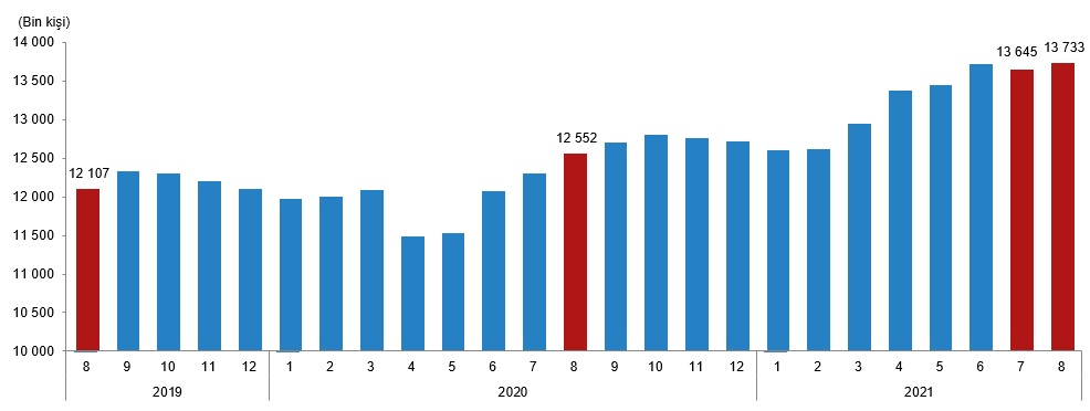 Sanayi, inşaat ve ticaret-hizmet sektörleri toplamında ücretli çalışan sayısı 2021 Ağustos ayında bir önceki yılın aynı ayına göre %9,4 arttı. Ücretli çalışan sayısı bir önceki yılın aynı ayında 12 milyon 552 bin 434 kişi iken, 2021 yılı Ağustos ayında 13 milyon 732 bin 736 kişi oldu.