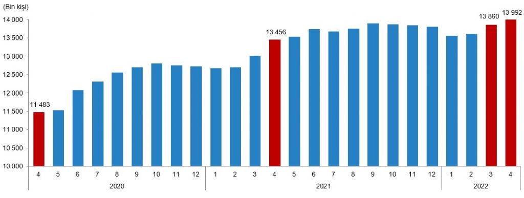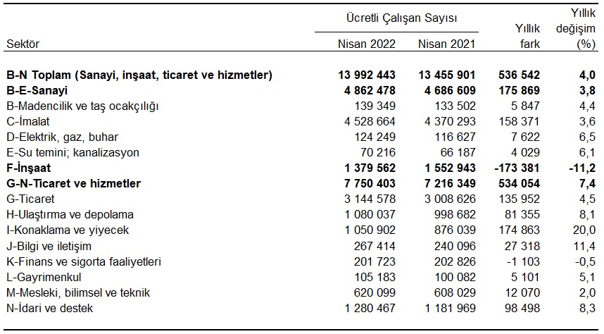 Sanayi, inşaat ve ticaret-hizmet sektörleri toplamında ücretli çalışan sayısı 2022 Nisan ayında bir önceki yılın aynı ayına göre %4,0 arttı. Ücretli çalışan sayısı bir önceki yılın aynı ayında 13 milyon 455 bin 901 kişi iken, 2022 yılı Nisan ayında 13 milyon 992 bin 443 kişi oldu.