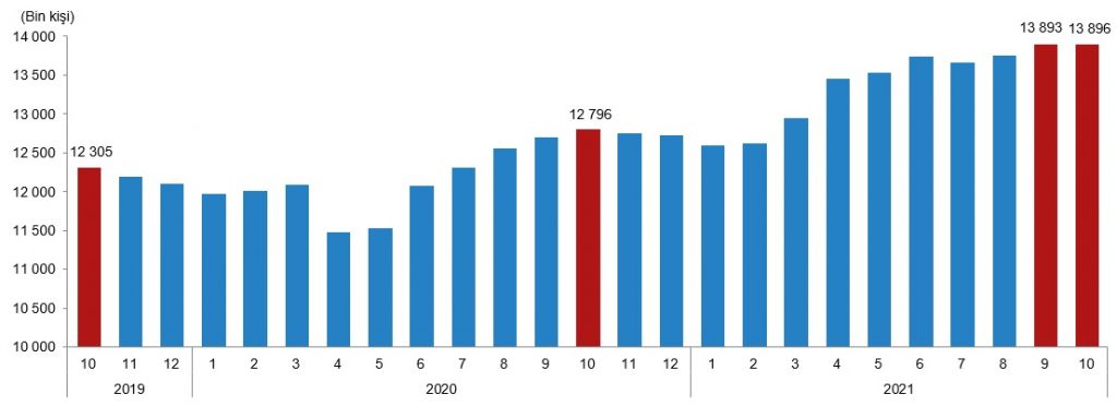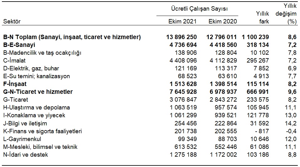 Sanayi, inşaat ve ticaret-hizmet sektörleri toplamında ücretli çalışan sayısı 2021 Ekim ayında bir önceki yılın aynı ayına göre %8,6 arttı. Ücretli çalışan sayısı bir önceki yılın aynı ayında 12 milyon 796 bin 011 kişi iken, 2021 yılı Ekim ayında 13 milyon 896 bin 250 kişi oldu.