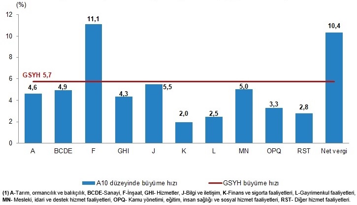 GSYH’yi oluşturan faaliyetler incelendiğinde; 2024 yılı birinci çeyreğinde bir önceki yıla göre zincirlenmiş hacim endeksi olarak; inşaat sektörü toplam katma değeri %11,1, bilgi ve iletişim faaliyetleri %5,5, mesleki, idari ve destek hizmet faaliyetleri %5,0, sanayi %4,9, tarım %4,6, hizmetler %4,3, kamu yönetimi, eğitim, insan sağlığı ve sosyal hizmet faaliyetleri %3,3, diğer hizmet faaliyetleri %2,8, gayrimenkul faaliyetleri %2,5 ve finans ve sigorta faaliyetleri %2,0 arttı.
