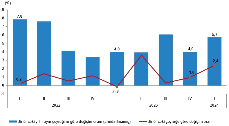GSYH 2024 yılı birinci çeyrek ilk tahmini; zincirlenmiş hacim endeksi olarak, bir önceki yılın aynı çeyreğine göre %5,7 arttı.