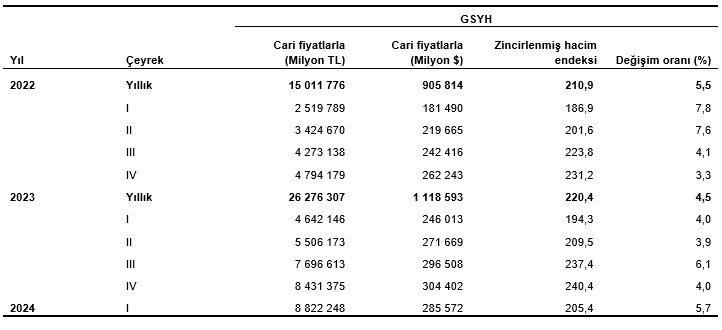 Üretim yöntemiyle Gayrisafi Yurt İçi Hasıla tahmini, 2024 yılının birinci çeyreğinde cari fiyatlarla bir önceki yılın aynı çeyreğine göre %90,0 artarak 8 trilyon 822 milyar 248 milyon TL oldu. GSYH’nin birinci çeyrek değeri cari fiyatlarla ABD doları bazında 285 milyar 572 milyon olarak gerçekleşti.